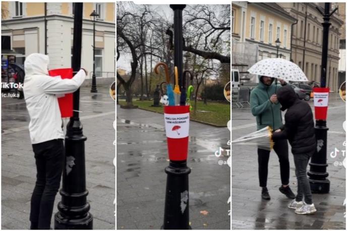 Poznati 25-godišnji tiktoker iz Pančeva Luka Alerić podelio je na svojim društvenim mrežama video u kojem je pokazao kako je, tokom kišnih i snežnih dana u centru svog grada postavio besplatne kišobrane i time pomogao svojim sugrađanima, koji nisu bili spremni za novonastale vremenske uslove.