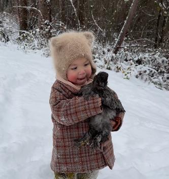 Dok šeta po snegu, ona se trudi da i kokoški ne bude hladno, te je čvrsto drži u svom naručju, a ni ona se ne buni. I ne samo to, devojčica je ljubi i mazi, dok se i sama jedva probija kroz sneg.