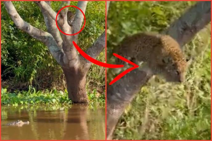Autor snimka, Italo Garsija Alves, koji je bio u tom području sa suprugom, primetio je veliku divlju mačku koja se popela na drvo i vrebala aligatore.