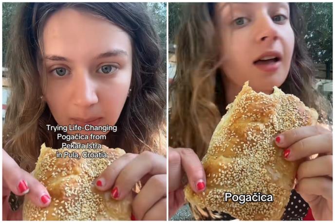 "Način na koji je sir složen s pecivom je fantastičan. Opsednuta sam ovim i jednostavno to moram da podelim s vama", rekla je dok je uzimala zalogaj. "Zanima me gde ovo još može da se kupi. Je li to lokalno? Ili nešto što može da se pronađe u celoj Hrvatskoj?", upitala je svoje pratioce.