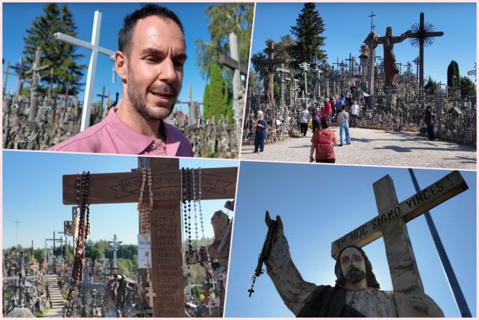 "Do ovog mesta, smeštenog na 12 km severno od grada Šjauljaja, stiže se iz Rige, prestonice Letonije. Nakon nešto manje od dva sata vožnje i ulaska u Litvaniju, dolazimo do ove lokacije. Brda visoka 10 metara prekriva neverovatna kolekcija krstova svih veličina, od onih minijaturnih veličine prsta, do onih monumentalnih, visokih po nekoliko metara. E sad, neko će reći pa ovolika količina krstova može da se vidi i na nekom većem groblju negde u svetu, ali razlika je ta što ovde ne leže mrtvi ljudi. Ovo je prosto jedno versko mesto i ništa više", rekao je Robert.