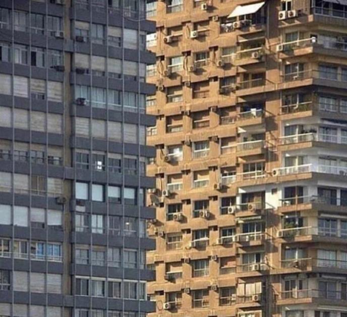 Zbog načina na koji su zgrade snimljene i njihovog spoja u perspektivi, ljudskom oku deluje kao da je desna napred — a zapravo je sve obrnuto.