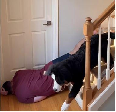 U videu prvi niz stepenice silazi bernski planinski pas Lui, koji bez zadržavanja prelazi preko vlasnika i odlazi pravo ka kuhinji. Za njim dolazi zlatni retriver koji takođe ne obraća pažnju na čoveka na podu, već ide direktno prema šporetu.Zatim dolazi drugi bernski planinski pas Fred, a na kraju i maleni pas koji se pridružuje ostatku čopora.