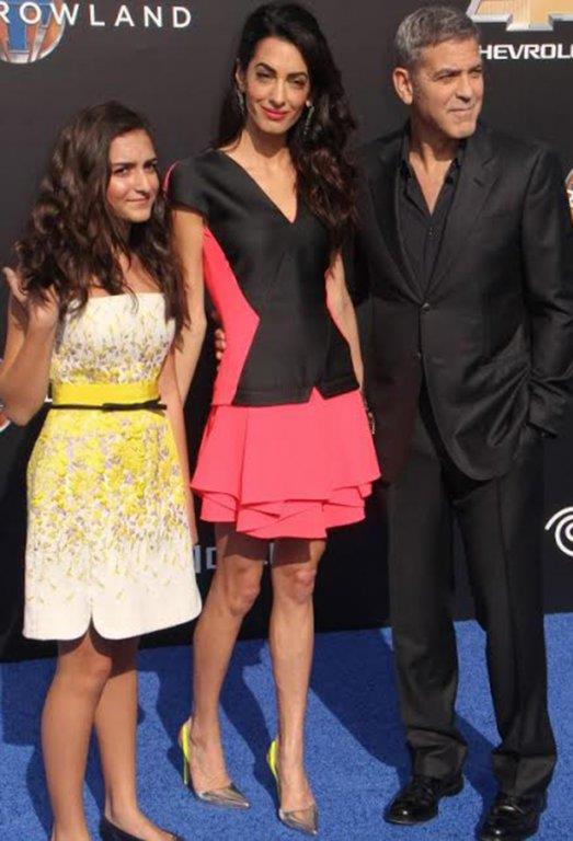 Amal je nosila haljinu interesantnog kroja - u kombinaciji koralne i crne boje, dok je mala Mia bila obučena u skladu sa svojim godinama (belo-žuta lepršava haljinica uz koju su uklopljene baletanke u teget boji).