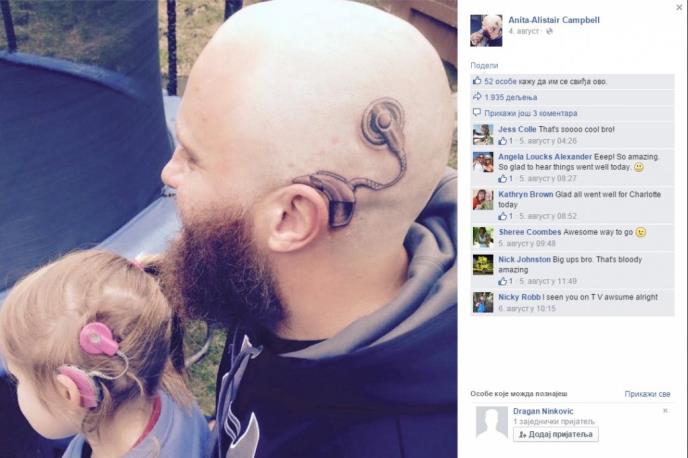 Naime njegova ćerka Šarlot je sa 4 godine dobia prvi slušni aparat a sa 6 je gotovo izgubila sluh. Ali kako bi joj bio podrška, njen otac Alistar Kempbel se ošišao na ćelavo i istetovirao slušni aparat na glavi.