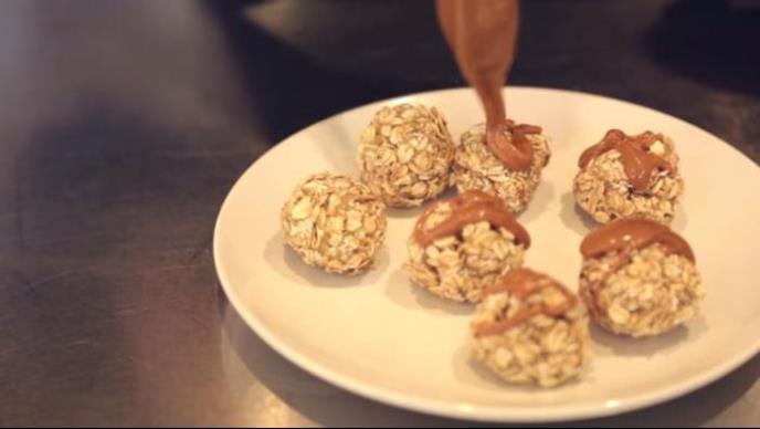 Izgnječite jednu bananu sa jednom šoljom ovsenih pahuljica. Od smese napravite loptice pa ih ubacite u mikrotalasnu na 1 minut. Na kraju prelijte ih kikiriki puterom.