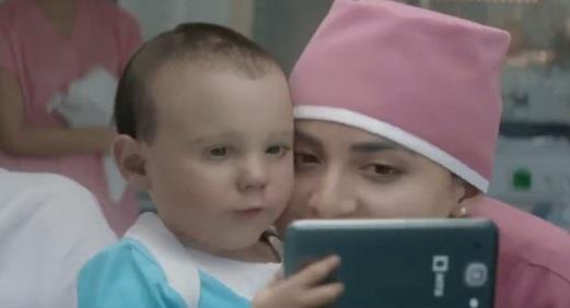 U ovom video klipu beba izlazi iz maminog stomaka, na tabletu vidi kako treba da se preseče pupčana vrpca, a zatim napravi selfi sa mediciskom sestrom.