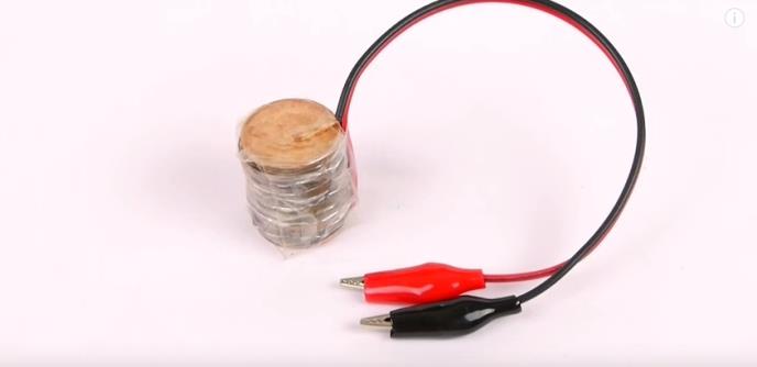 Ova gomilica novčića ima jačinu od četiri volti. Ukoliko dalje dodate žice, kao autor ovog snimka moći ćete u domaćoj varijanti da napravite skromni punjač.