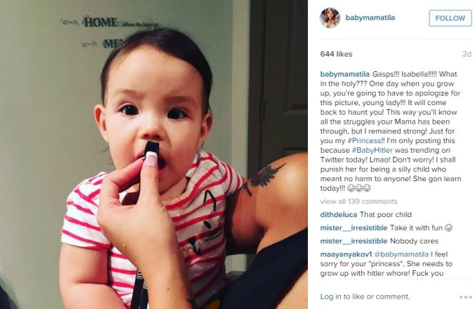 "Izabela!!! Šta to radiš??? Jednog dana, kada porasteš, izvinjavaćeš se zbog ove slike, mlada damo! Vratiće se da te progoni! Tako ćeš barem znati kroz kakve stvari je prolazila tvoja mama, a opet ostala jaka! Samo za tebe moja princezo! Jedini razlog zašto objavljujem ovo je haštag BabyHitler koji je trendovao na Twitteru danas. LMAO! Ne brinite, kazniću je što je bila šašavo dete koje nije mislilo ništa loše!", dodala je ona.
