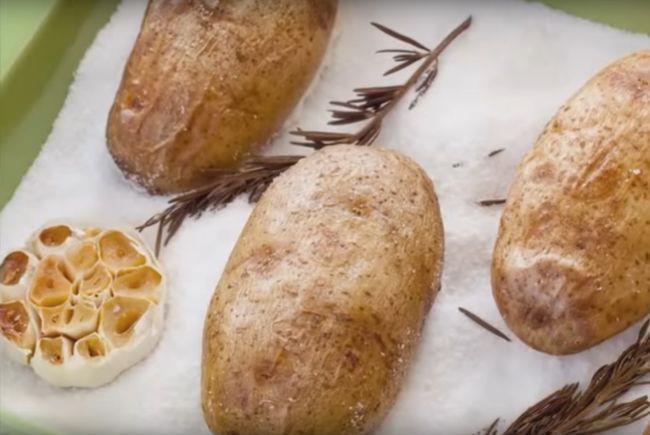 Uz pomoć soli možete dobiti najmekše pečene krompire fenomenalnog ukusa. Najpre u pleh ili vatrostalu posudu sipajte so, oko 2 1/2 šolje. Preko poređajte 4 neoljuštena krompira, dve grančice ruzmarina. Glavici belog luka odsecite donju četvrtinu čenova i stavite ih u pleh s odsečenim delom okrenutim na gore. Prekrite pleh aluminijumskom folijom i stavite u rernu zagrejanu na 220 stepeni C i pecite oko 75 minuta.
