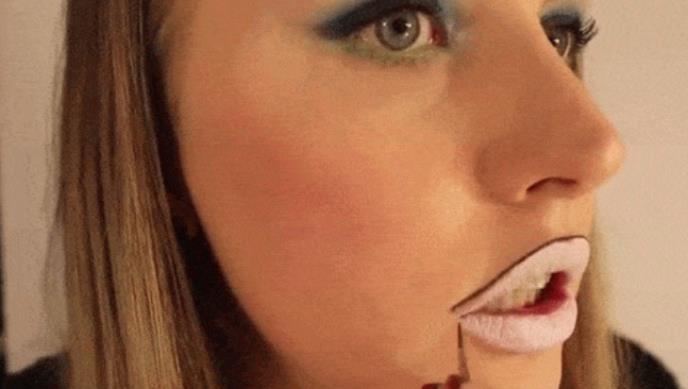 Šminkerka, Stjima počinje video sa belim karminom preko celih usta, što će biti belina u očima.