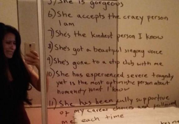 "Nisam jednostavna osoba i sa mnom je teško živeti. Zapravo, ponekad izgubim svaku nadu, a svoj bes usmerim prema suprugu. On mi uvek oprosti. Svestan je da sam obolela. Drži me za ruku i daje sve od sebe", napisala je Moli i objavila sliku ogledala na kojem joj je suprug napisao poruke.