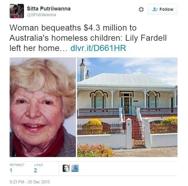 Lili Fardel iz Australije oduševila je čitavu planetu kada je posle smrti ostavila svoje imanje deci bez krova nad glavom.