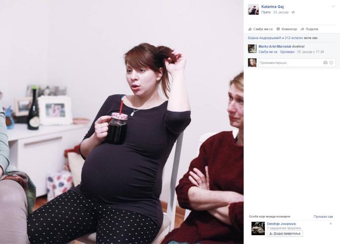 "Na ovoj slici dole, je moja ćerka sa 12 nedelja. Gospođica se naslonila, digla nogu, pije mlako pivo i rešava ukrštenice. Od tog trenutka se zezamo kako je mali Mlađa. Mali Mlađa. Svaki put kad me šutne a ja pomislim "leži i reži " ili što jes jes..." Porodila sam se iznenada.Čak tri nedelje ranije. Neočekivano i vrlo iznenada.Porodila sam se na dan kada je moj deda rođen.Porodila se na dedin rođendan.I sve što imam da kažem o ležanju u bolnici je...Divan dan, divan dan, ne perem se a ni umivam. Nemam kada. Dobila sam malog Mlađu", zaključila je svoju zanimljivu priču ova novopečena mama.