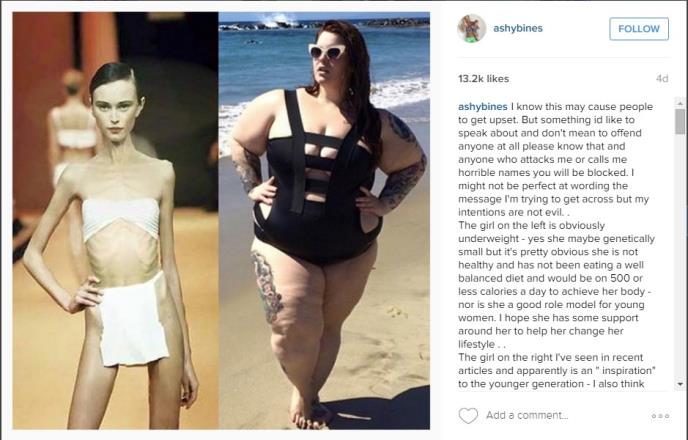 U pomenutom postu uporedila je premršavu manekenku sa plus sajz modelom Tes Holidej i istakla da nijedna od njih ne treba da bude uzor mladim devojkama.