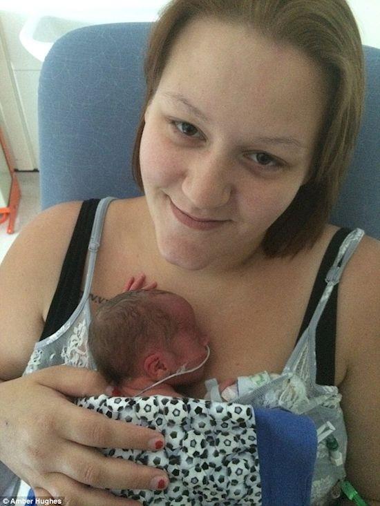21-godišnja Amber Hjuz videla je pogled kompletnog šoka na licu njenog partnera kada je njen doktor pokušao da porodi njenog sina, Olija, carskim rezom u 30. nedelji.