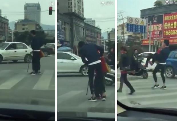 Young man sweeps off an elderly lady with walking difficulty off her feet to help her cross road in #China’s Fujian