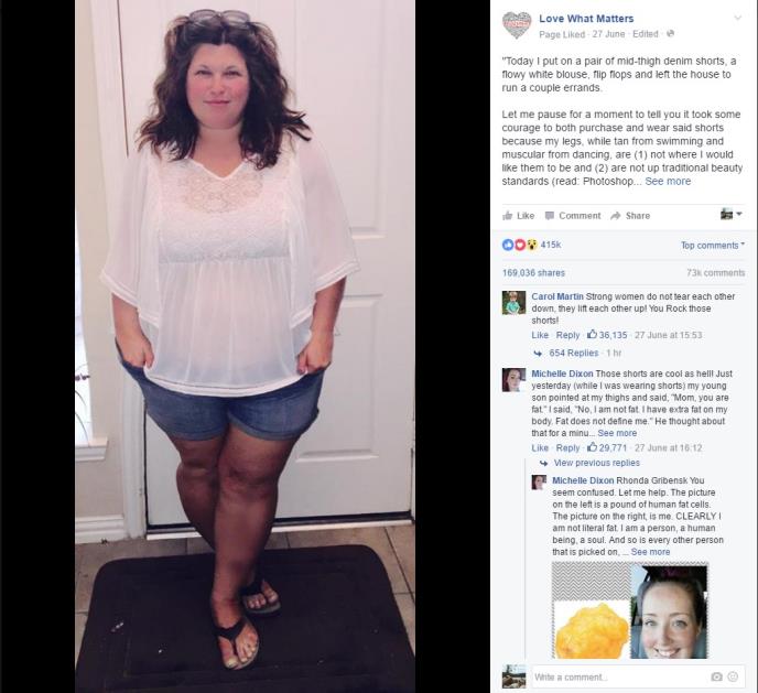 Ali to je tema nekog drugog posta na Fejsu. Slušajte, ljudi. Naročito žene. Plus sajz ne mora nužno da znači da neko nije zdrav. Plus sajz ne mora da znači da je neko lenj po svaku cenu. Plus sajz ne znači da je neko ružan ili neprivlačan ili netalentovan ili MANJE ČOVEK. Možda imate problem s mojim telom. Ja ga nemam. I naporno sam radila kako bih prevazišla osuđujuću porodicu i prijatelje, razvod, depresiju. Žene, ne udarajte jedna na drugu. Slavite jedna drugu. Svakog dana."