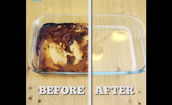 Stavite pleh pod toplu vodu, dodajte deterdžent za sudove i napunite većinu pleha vodom. Uzmite alu-foliju i lagano je zgužvajte. Folijom prelazite preko zagorenih ostataka koristeći i sapunicu od deterdženta.