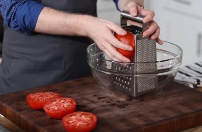 Presecite paradajz na polovine, a zatim ga izrendajte. Ostaće vam samo tanka ljuska, koja vam ovde nije potrebna.