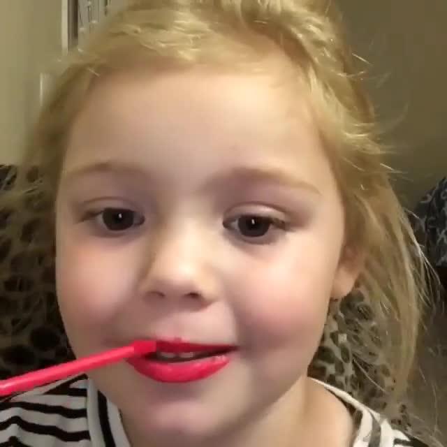 U snimku možete videti da se devojčica šminka poput profesionalca... ona nanosi karmin, podlogu za puder, puder, korektor... sve po redu...