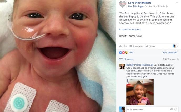 "Naša prva ćerka ovde je stara samo pet dana. 1,7 kg. Srećna je što je živa! U ovu sliku sam često gledala kako bih izdržala uspone i padove naših dana na odeljenju za intezivne bolesti. Život je dragocen!"