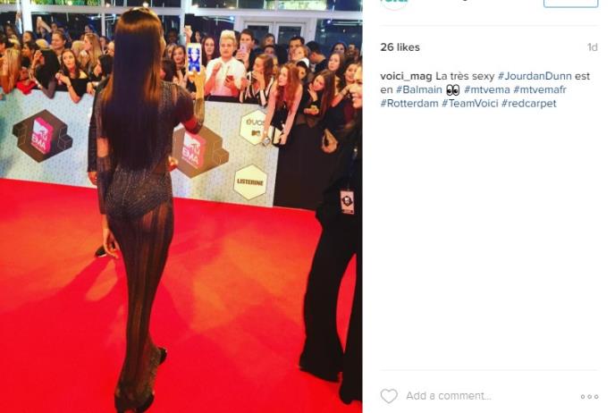 Džordan je ponela haljina poznatog francuskog dizajnera koja je otkrivala dosta toga. Provokativna, providna toaleta otkrivala je manekenkine gurdi, pa je tako publika jasno mogla da vidi njene bradavice.
