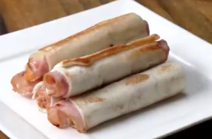 Zatim hleb rastanjite oklagijom, stavite list-dva šunke, zavisi od veličine, traku kačkavalja, zarolajte, pa propržite na malo ulja dok hleb ne dobije lepu zlatnu boju.