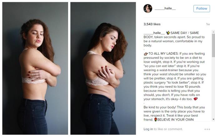 Blogerka Hali je na svom Instagram profilu pokazala da ne treba uvek verovati takozvanim "pre i posle" fotografijama kojima se reklame preparata za mršavljenje najčešće služe. Fotografisala se u razmaku od jednog minuta u dve različite poze. Na jednoj fotografiji izgleda drastično mršavije nego na drugoj.