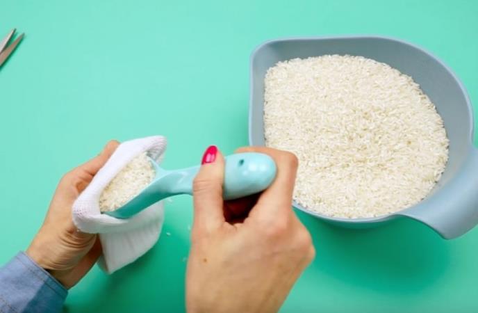 Napunite tkaninu pirinčem, a kad to završite, vežite i drugi kraj belim koncem.