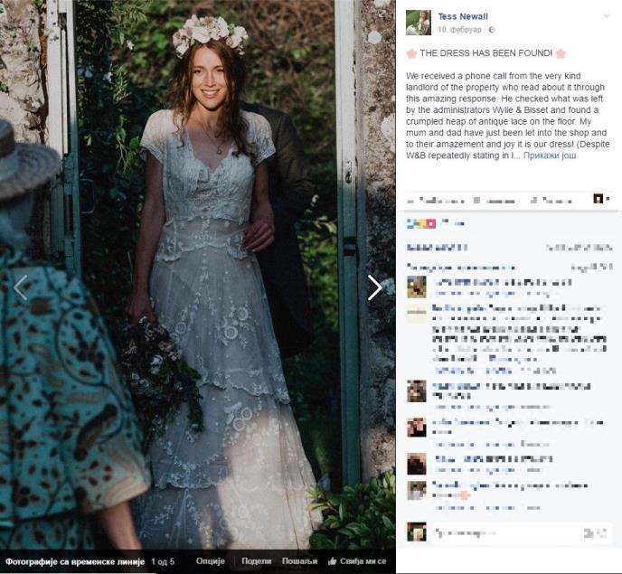 Tes se prošle godina udala u prabakinoj venčanici, nakon čega ju je odnela na hemijsko čišćenje i od tada je više nije videla. Radnja se u međuvremenu zatvorila, a haljina ostala sa starim stvarima. Srećom, venčanica je ponovo u Tesinim rukama.
