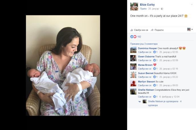 "Mama mi je rekla da treba najmanje šest nedelja posle porođaja da se žena "oporavi". Počela sam se osećati baš iscrpljeno. Prvo mi nije bilo jasno zašto, a onda sam Benu rekla da mislim da sam opet trudna. Počeo je da se smeje. Uradili smo test i bio je negativan. Kroz sledeće dve nedelje uradila sam još četiri testa koji su pokazali da sam trudna. Na ultrazvuku su mi rekli da ću roditi blizance", priča Eliz, koja nije imala problema u trudnoći i blizance je rodila nakon 36 nedelja. Bebe su bile zdrave i imale su po tri kilograma.