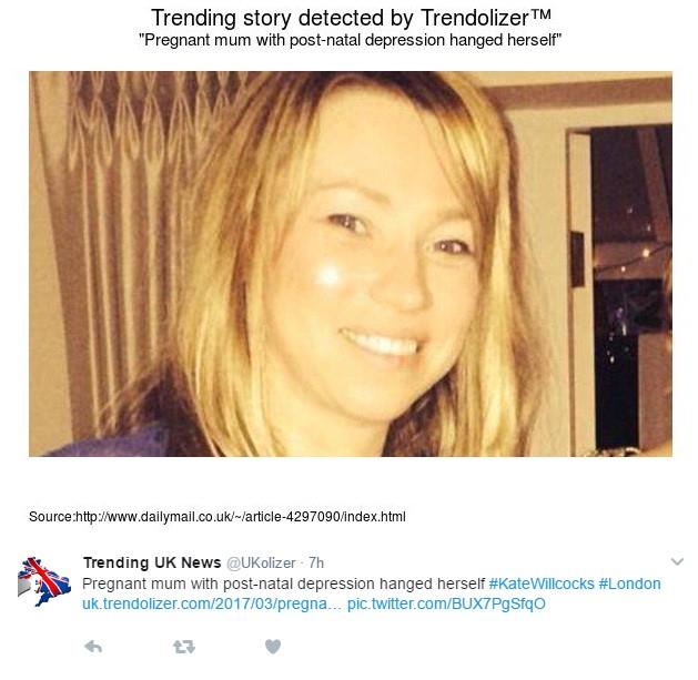 Kejt Vilkoks (36) je pronađena kako visi u ormanu dok je bila u tridesetoj nedelji trudnoće. Ona je posle prvog porođaja kada je dobila ćerku Iris 2014. godine, počela da pati od depresije.