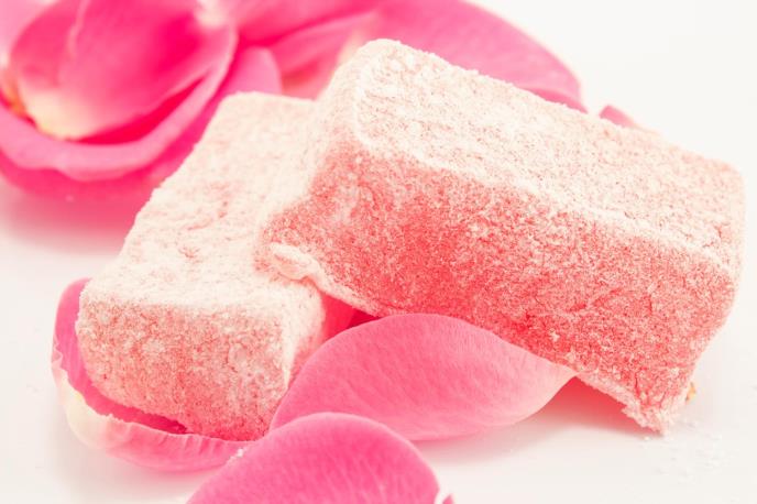 4. Dodajte 6-8 kapi esencije ruže. Masu naspite u tepsiju, a kada se ohladi isecite na sitne komade i uvaljajte u prah šećer.