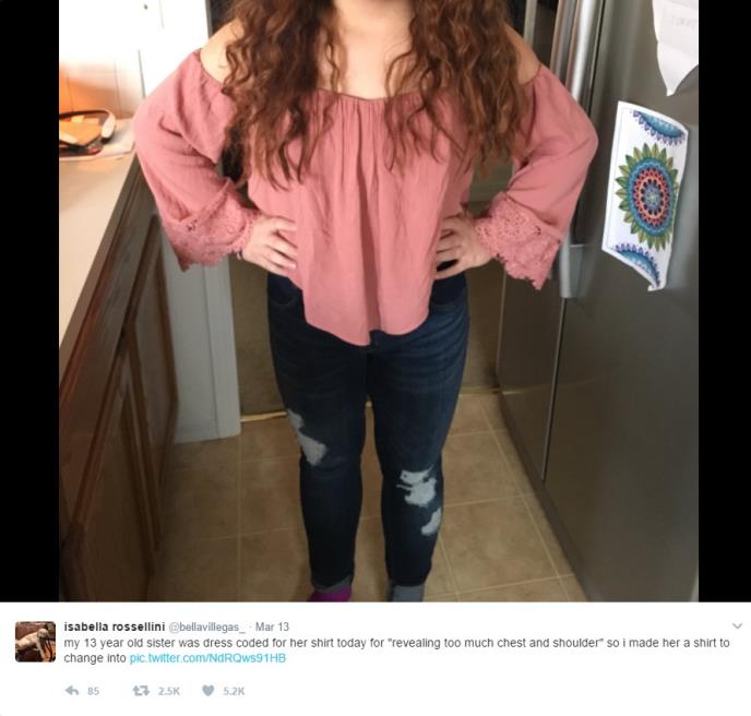 Grejs Roselni (13) krenula je u školu u roze bluzi dugih rukava i golih ramena, što je izazvalo negativne komentare nastavnika i školskih drugara.