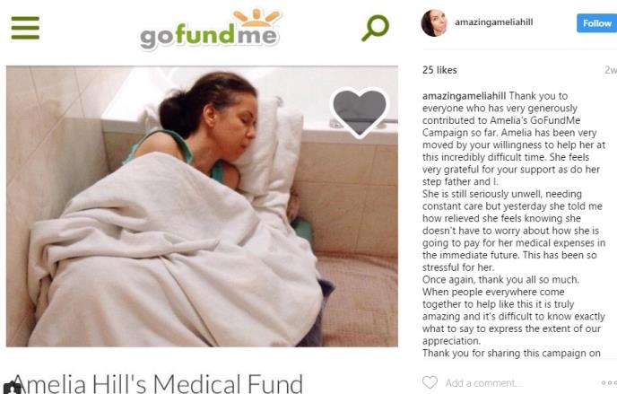 Njena dobra prijateljica je napravila stranicu gde se može donirati novac kako bi Amelija mogla da plati specijalizovani kućnu negu, lečenje i medicinsku opremu.