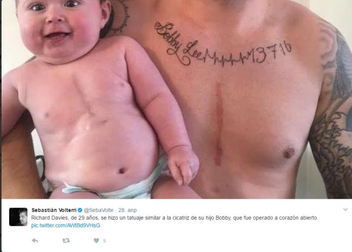 Maleni Bobi Dejvies rođen je s pola srca zbog urođenog defekta i nakon operacije na srcu ostao mu je veliki ožiljak na prsima. Njegov otac rešio je da istetovira na gurdima ožiljak kako bi pružio podršku svom malenom sinu.