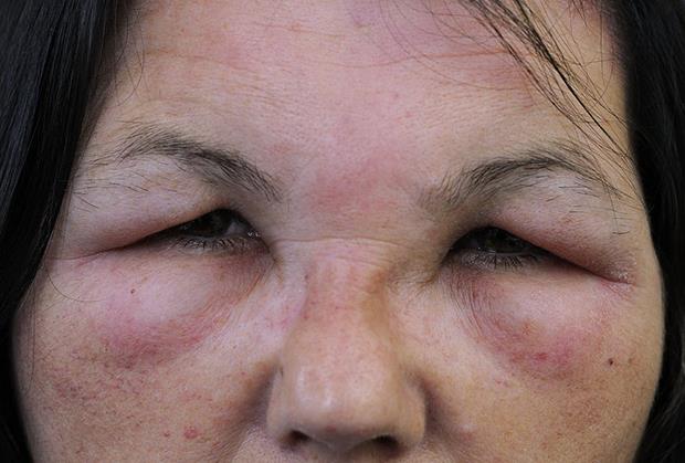Kod lakših reakcija na test pojaviće se crvenilo na koži, a ako ne prepoznate prve simptome i prefarbate celu kosu, može doći do oteklina na čitavom licu. Otok bude naročito ispoljen u predelu očiju, koje se mogu skoro potpuno zatvoriti. Nije retkost da lice bude prekriveno crvenim plikovima a svrab bude nepodnošljiv, kao da imate ujede komaraca po celoj glavi.