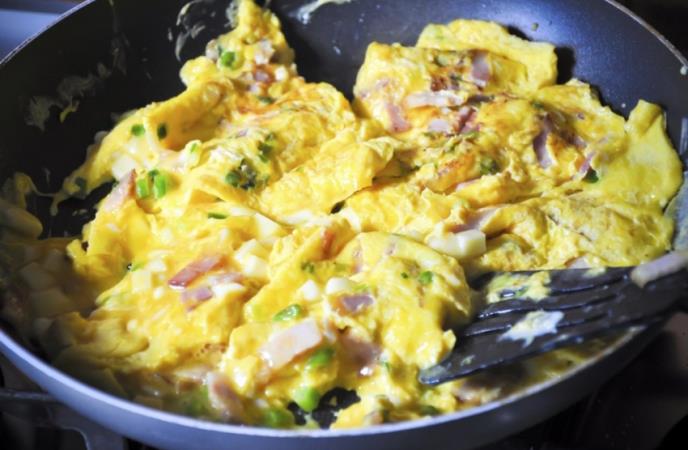 Prepržite slaninicu i prelijte je sa kajganom od dvoje jaja. Zatim je servirajte uz krišku starog sira, tosta i salate od 1 paradajza i veze rukole.