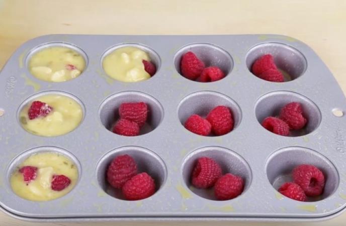 Priprema: zgnječite 2 banane, zatim u njih dodajte i umutite 4 jaja. Smesom prelijte maline koje ste stavili u pleh za mafine.