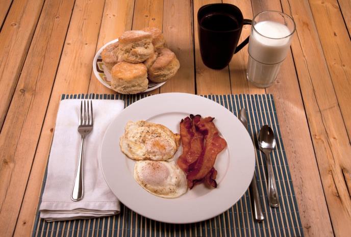 Doručak: Kajgana i pržena slanina bez ulja, čaj