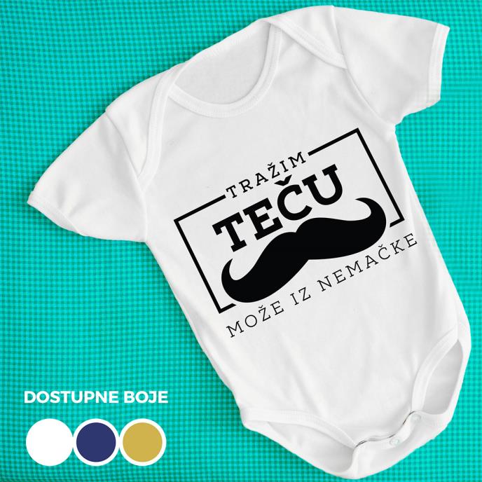 Tetke kao počasni članovi porodice zauzimaju posebno mesto u životu bebe, a tetka bez teče ne ide. Pomozimo tetki, a i bebi da dobije teču! Ovaj bodi sa natpisom: Tražim teču, može i iz Nemačke, je jako kreativan i nasmejaće okolinu! Bodi je dostupan u veličinama za uzraste od 0 do 24 meseca i u više boja, njegova cena je 750 rsd, a OVDE ga možete poručiti, ili pozivati na broj 011/44020-502.