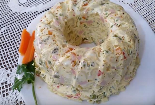 Skuvati makarone i procediti i ohladiti. Dodati sve navedene namirnice i dobro izmešati.