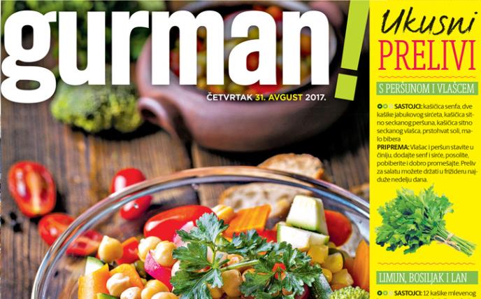 U današnjem poklon dodatku Gurman pronaći ćete recepte za pripremu jednostavnih, a ukusnih i zdravih salata kao obroka: salata od svežeg spanaća i karfiola, tunjevina sa pastom, salata od piletine, krompir salata, Valdorf Astorija itd.