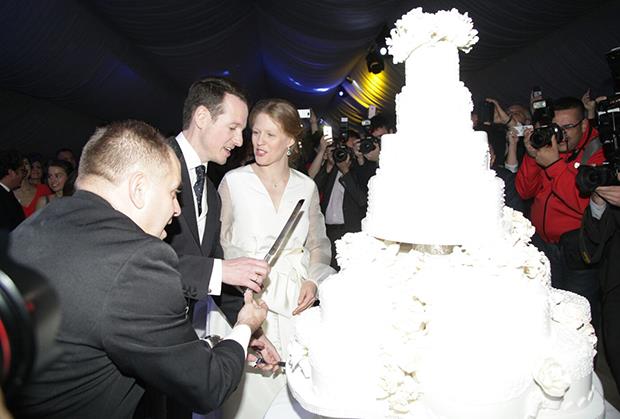 Nakon toga stigla je bela torta na dva sprata, čije su prvo parče isekli mlada i mladoženja zajedničkim snagama.