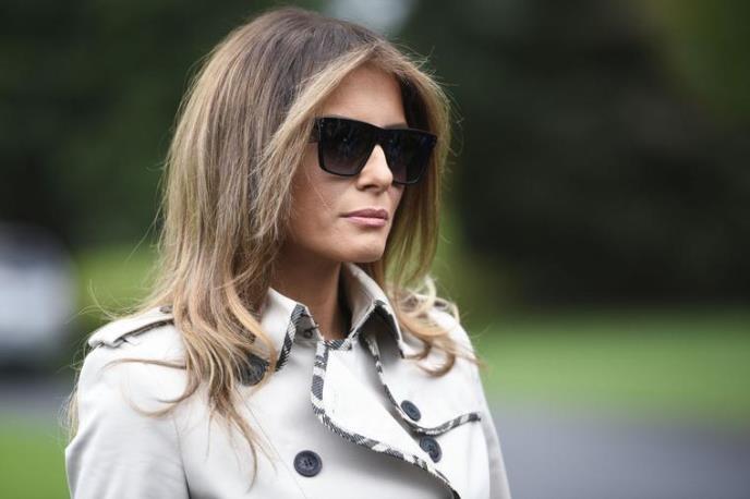 Melanija je uparila mantil koji je u klasičnoj drap boji, ali koji je oivičen čuvenom Barberi šarom, crne pantalone i kao veliku promenu, crne baletanke modne kuće Kristijan Labuten.