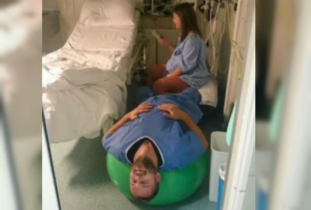 Na Fejsbuk stranici KB Merkur objavljena je slika iz bolnice, gde mlada buduća mama sedi i s osmehom tipka na mobilnom telefonu, a mladi tata je obučen u bolničku odeću i isteže se na pilates lopti.