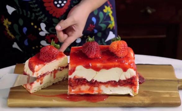 U pravouganoj posudi obloženoj providnom folijom stavite smesu sa krem sirom, filujte smesom od džema i seckanih jagoda, pa prekrijte ostatkom krema.