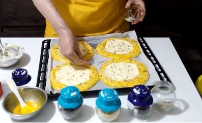 Ostaviti 15 minuta, pa svaku lepinju pritisnuti po sredini veličine manjeg tanjira. Sir izdrobiti dodati jaje u sir i iznešati. Puniti lepinje gde su udubljenja. Ivice lepinja možeta premazati žumancetom i posuti semenkicama. Peći na 200 stepeni stepeni 20 minuta.