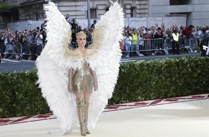 Pevačica Keti Peri ušetala je na crveni tepih u zlatnoj haljini s ogromnim anđeoskim krilima. S njom nije bio u pratnji dečko, glumac Orlando Blum (41).